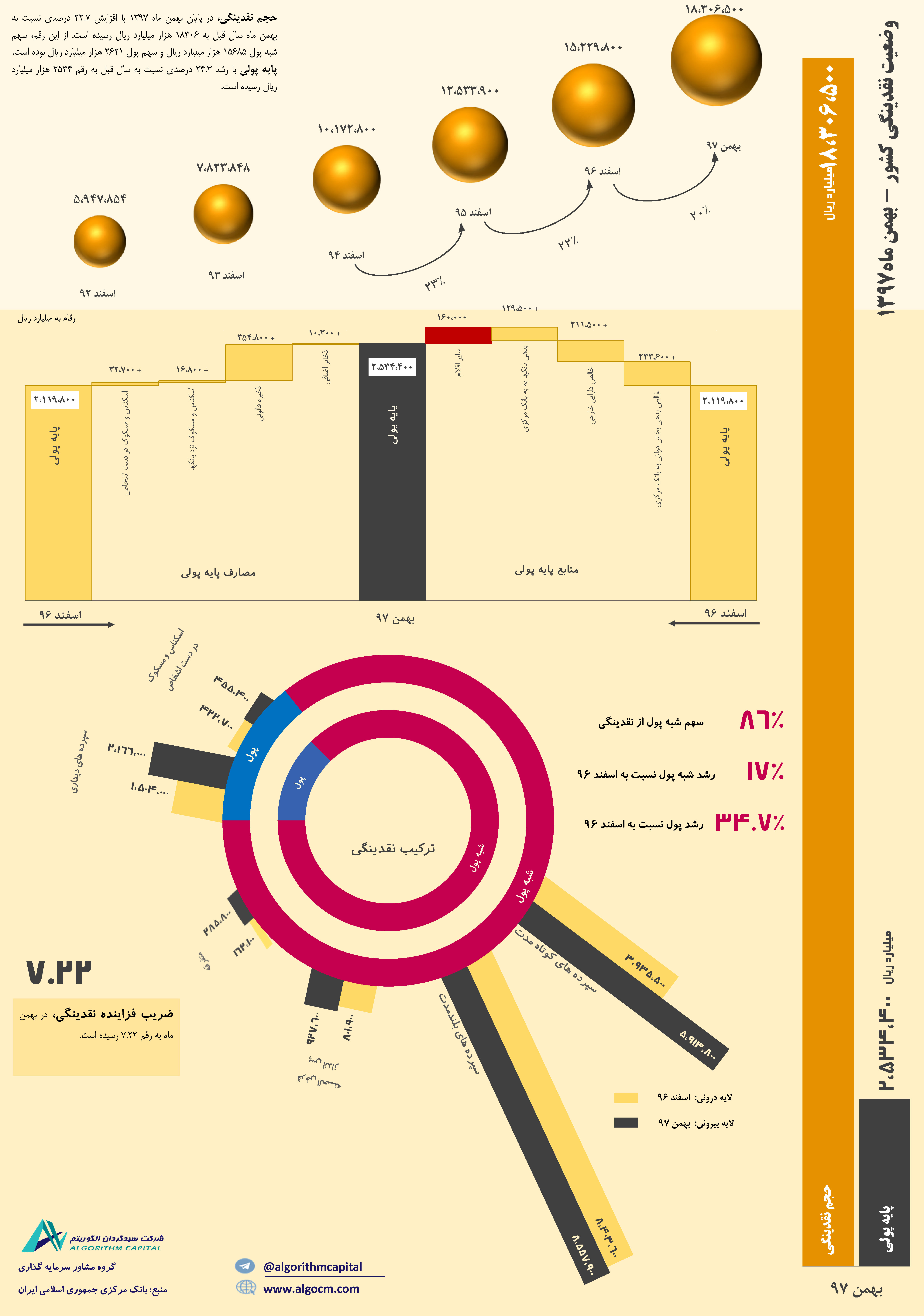 حجم نقدینگی، در پایان بهمن ماه 1397 با افزایش 23 درصدی نسبت به بهمن ماه سال قبل به 18306 هزار میلیارد ریال رسیده است. از این رقم، سهم شبه پول 15685 هزار میلیارد ریال و سهم پول 2621 هزار میلیارد ریال بوده است. در پایان بهمن ماه 96 پایه پولی نسبت به سال قبل 24 درصد رشد داشته است. از عوامل تاثیرگذار در رشد پایه پولی می توان به رشد 6/16 درصدی خالص دارایی خارجی بانک مرکزی و رشد 5/12 درصدی خالص بدهی بانک ها به بانک مرکزی اشاره کرد.