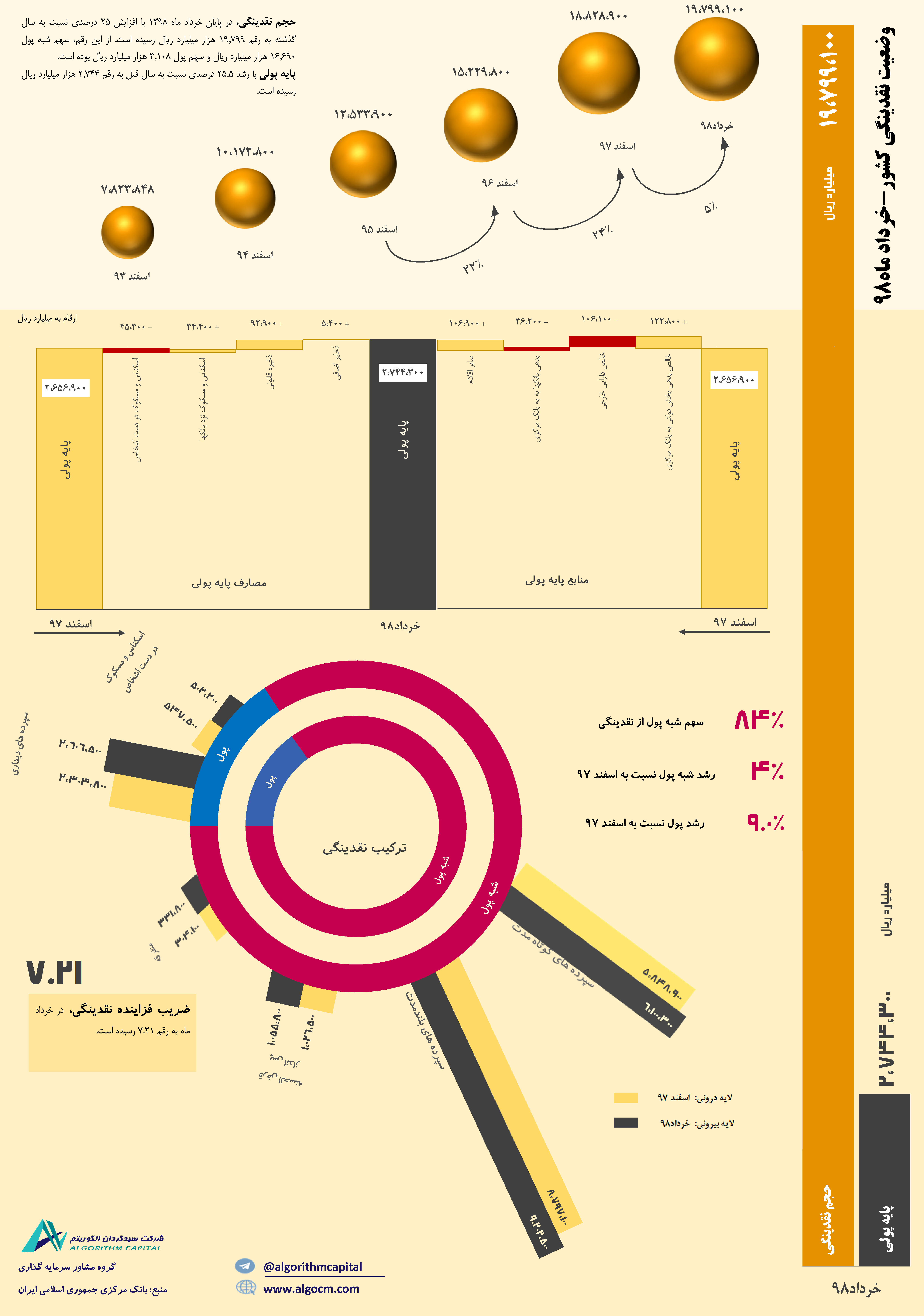 حجم نقدینگی، در پایان خرداد ماه 1398 با افزایش 25 درصدی نسبت به سال گذشته به رقم 19,799 هزار میلیارد ریال رسیده است. از این رقم، سهم شبه پول 16,690 هزار میلیارد ریال و سهم پول 3,108 هزار میلیارد ریال بوده است. پایه پولی با رشد 25.5 درصدی نسبت به سال قبل به رقم 2,744 هزار میلیارد ریال رسیده است. در پایان سه ماهه نخست سال جاری بدهی بانکها به 1,345 هزار میلیارد ریال رسیده که نسبت به خرداد ماه سال گذشته ۳.۷ درصد کاهش داشته است.