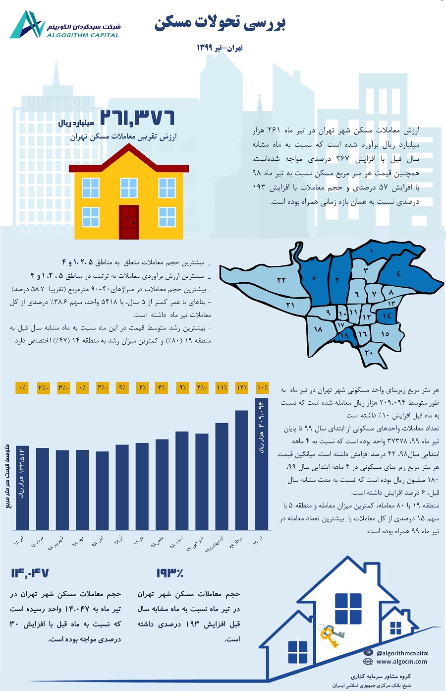 در معاملات تیر ماه 99 مسکن در شهر تهران، قیمت و حجم معاملات به ترتیب 10 و 30 درصد نسبت به ماه قبل رشد داشته است.