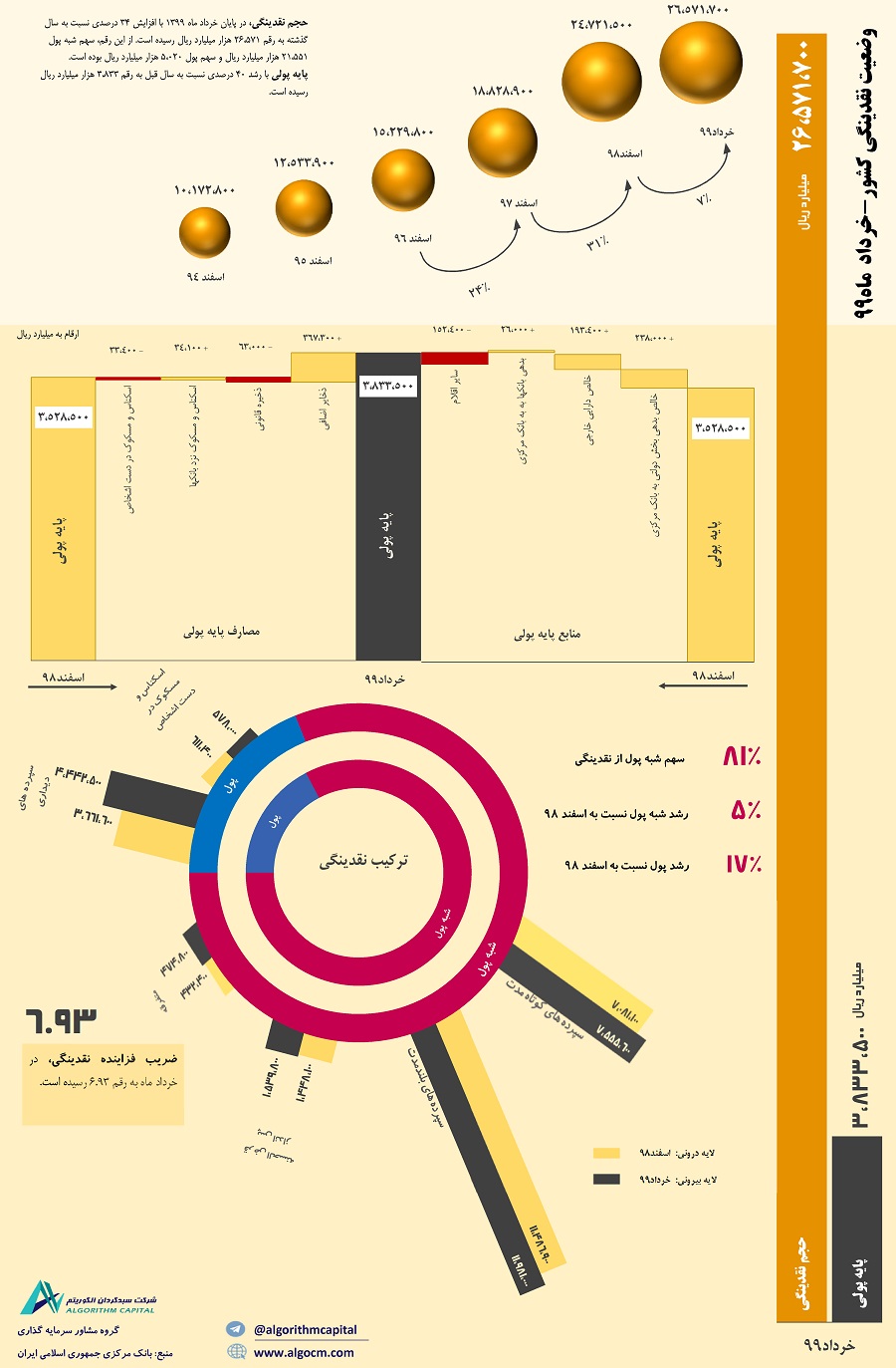 حجم پول و شبهپول که دو جزء اصلی نقدینگی هستند به ترتیب رشد 61 و 29 درصدی نسبت به سال گذشته داشته اند. همچنین نسبت پول از حجم نقدینگی از 16% در انتهای بهار سال 98 به 19% در سال 99 افزایش یافته است.