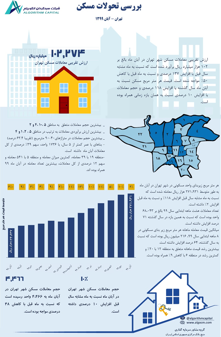در آبان ماه متوسط قیمت معامله شده یک متر زیر بنای مسکونی ۲71,931 هزار ریال بود که نسبت به ماه قبل و ماه مشابه سال قبل به ترتیب 2 و 118 درصد رشد داشته است. همچنین بیشترین رشد قیمت ماهانه متعلق به منطقه 12 با 20% و کمترین رشد در منطقه 6 با کاهش 9% همراه بوده است.