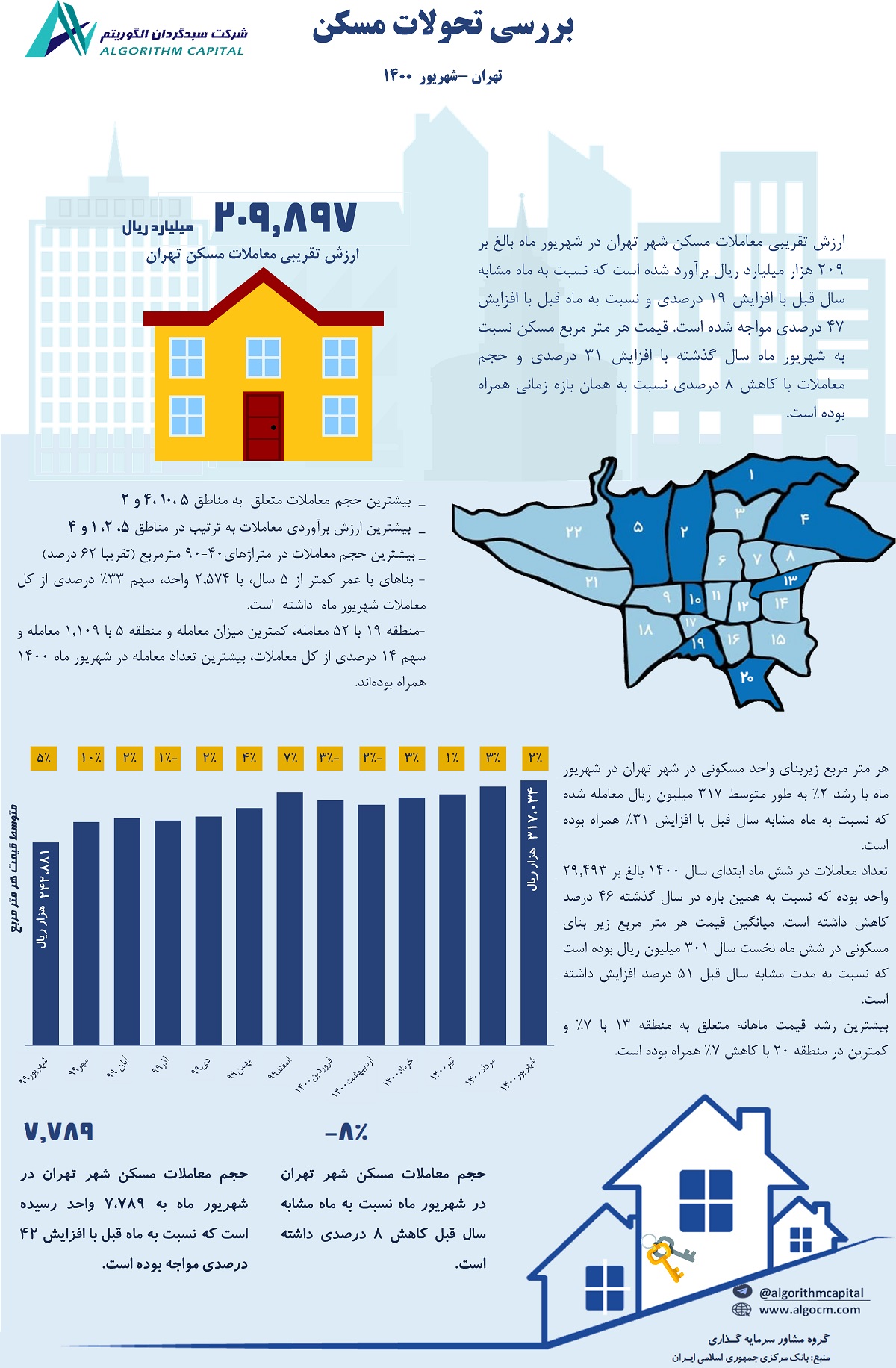 در میان مناطق 22 گانه تهران، بیشترین متوسط قیمت معامله یک متر زیر بنای مسکونی معامله شده معادل 689 میلیون ریال به منطقه یک (رشد 36 درصدی نسبت به ماه مشابه سال قبل) و کمترین آن با 150 میلیون ریال به منطقه 18 (رشد 44 درصدی نسبت به ماه مشابه سال قبل) تعلق داشته است. همچنین بیشترین رشد قیمت ماهانه متعلق به منطقه 13 با 7 درصد و کمترین در منطقه 20 با کاهش 7 درصد همراه بوده است.