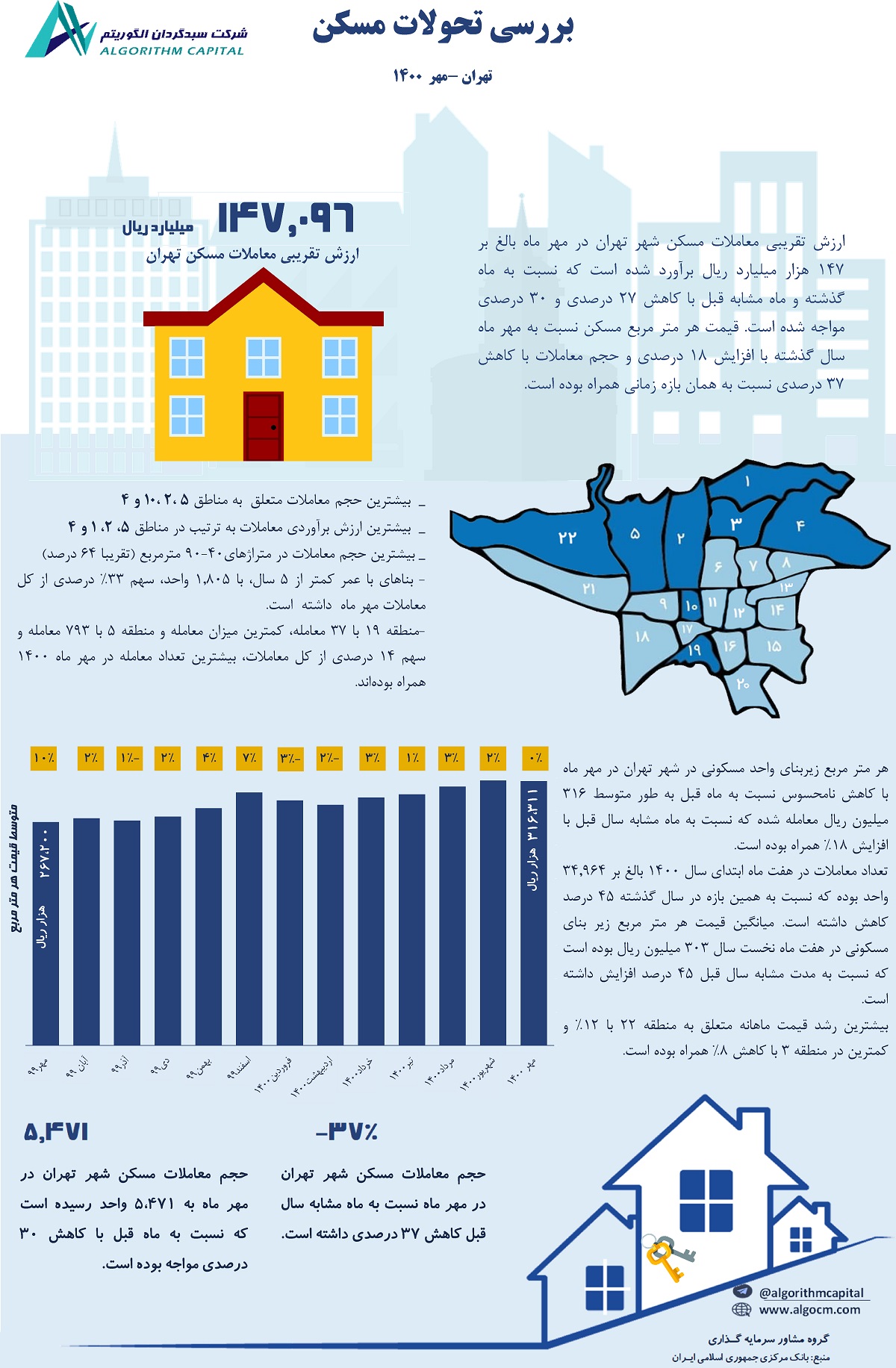 میانگین قیمت ماهانه هر متر مربع زیر بنای مسکونی در هفت ماهه ابتدایی سال 1400، بالغ بر 303 میلیون ریال بوده که نسبت به میانگین قیمت ماهانه بازه مشابه سال گذشته، 45 درصد افزایش داشته است. تعداد معاملات واحدهای مسکونی در در بازه مذکور بالغ بر 34,964 واحد بوده است که نسبت به همین بازه در سال گذشته با کاهش 45 درصدی همراه بوده است. میانگین ماهانه تعداد معاملات در هفت ماه ابتدایی سال 4,995 واحد بوده است به طوریکه در همان بازه زمانی سال گذشته، متوسط ماهانه تعداد معاملات 9,082 واحد بوده است.
