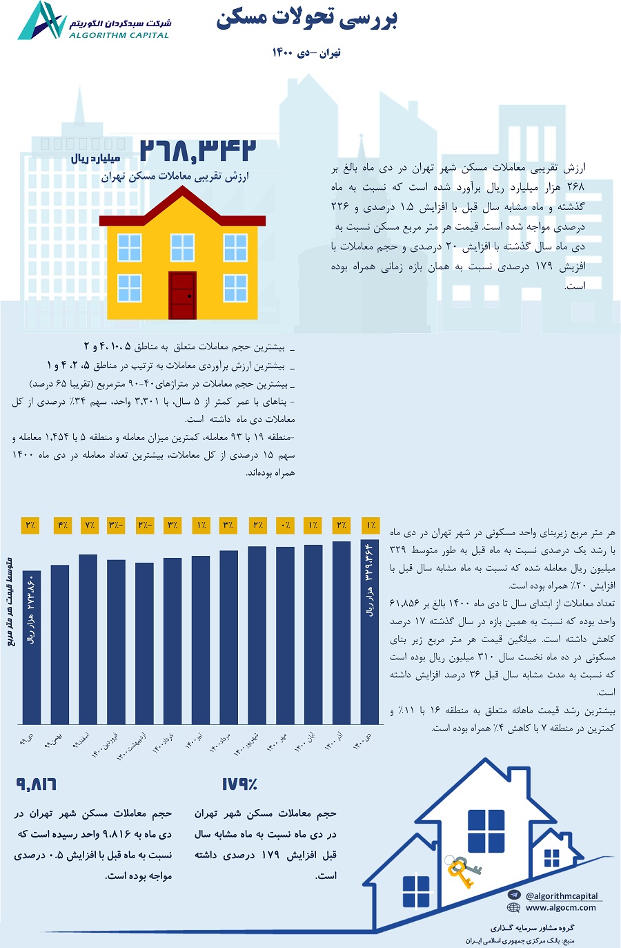 میانگین قیمت ماهانه هر متر مربع زیر بنای مسکونی در ده ماهه ابتدایی امسال با رشد 36 درصدی نسبت به بازه مشابه سال گذشته، بالغ بر 310 میلیون ریال بوده است. همچنین تعداد معاملات واحدهای مسکونی در بازه مذکور بالغ بر 61,856 واحد بوده است که نسبت به همین بازه در سال گذشته با کاهش 17 درصدی همراه بوده است. میانگین ماهانه تعداد معاملات از ابتدای سال تا انتهای دی ماه، 6,186 واحد بوده است به طوریکه در همان بازه زمانی سال گذشته، متوسط ماهانه تعداد معاملات 7,411 واحد بوده است.