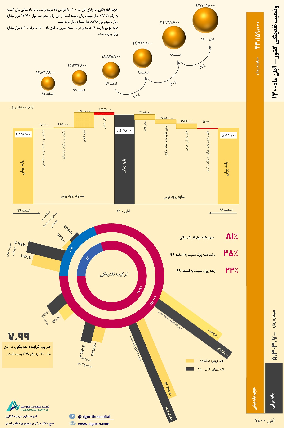 آمار مربوط به بخش پولی و بانکی تا پایان آبان سال جاری توسط بانک مرکزی گزارش شده است. در گزارش ارائه شده حجم نقدینگی در آبان ماه 1400 با رشد 42 درصدی نسبت به ماه مشابه سال گذشته همراه بوده که میزان رشد نقدینگی در مقایسه با بازه زمانی مشابه سال گذشته 5 واحد درصد بیشتر بوده است. حجم نقدینگی از ابتدای سال 24 درصد و به صورت ماهانه میانگین رشد 2.7 درصد را به همراه داشته است. از حیث مبلغی از ابتدای سال به میزان 8,397 هزار میلیارد ریال نقدینگی افزایش یافته و به رقم 43,159 هزار میلیارد ریال در انتهای آبان ماه رسیده است. بیشترین مبلغ افزایش ماهانه مربوط به مهر ماه به میزان 1,598 هزار میلیارد ریال بوده است.