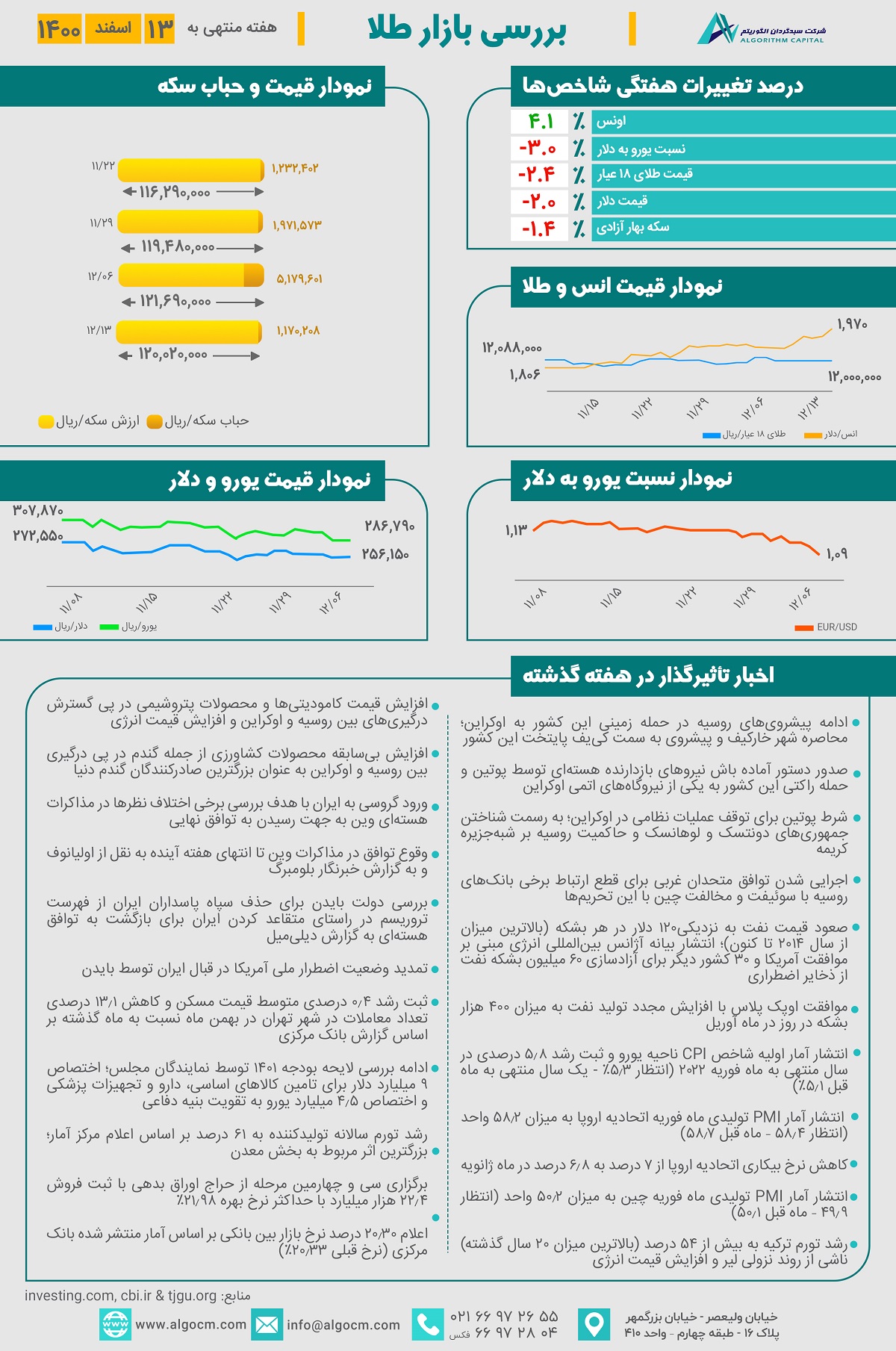 با توجه به افزایش تنشهای بین روسیه و اوکرین و حمله روسیه به نیروگاه هستهای زاپوریژیا، اونس طلا 1,970 دلار رسید و بازده هفتگی 4.1% را ثبت نمود. با توجه به اخبار مثبت از مذاکرات برجامی و افزایش گمانه زنیها در مورد حصول توافق در آینده نزدیک، نرخ دلار با کاهش 2 درصدی همراه بود و به رقم 256,150 ریال رسید. در پی نوسانات نزولی نرخ ارز، هر گرم طلای 18 عیار و سکه بهار آزادی به ترتیب با کاهش 2.4% و 1.4% همراه بوده است. حباب سکه نیز در هفته گذشته کاهش یافت و به رقم 1,170,000 ریال رسید.