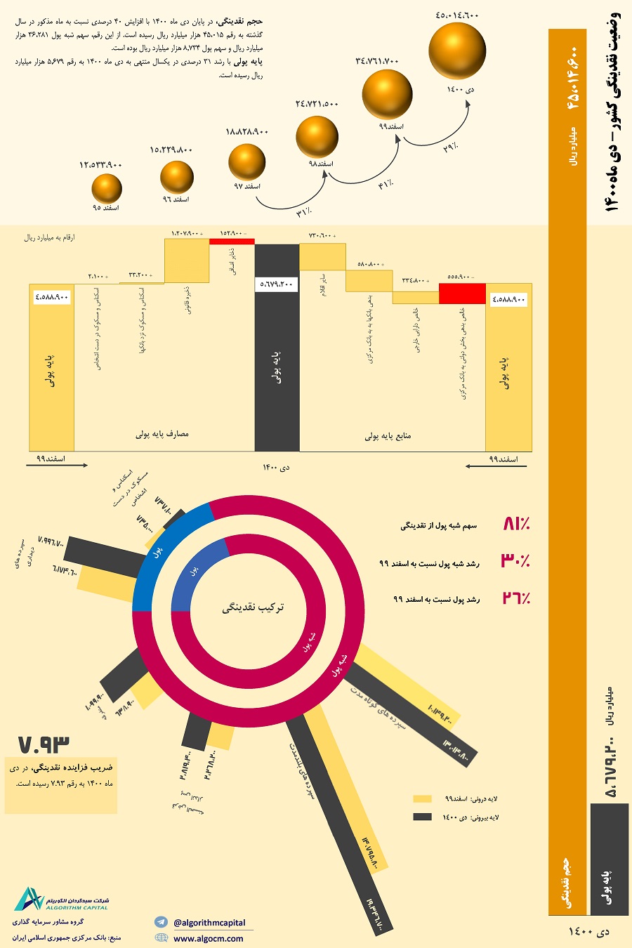 آمار مربوط به بخش پولی و بانکی تا پایان دی ماه سال 1400 توسط بانک مرکزی ارائه شده است. با توجه به روند نزولی رشد نقطه به نقطه حجم نقدینگی در نیمه دوم سال 1400، حجم نقدینگی در دی ماه 1400 با رشد 40 درصدی نسبت به ماه مشابه سال گذشته همراه بوده و این نرخ در مهر، آبان و آذر 1400 به ترتیب 43، 42 و 41 درصد بوده است. همچنین رشد ماهانه نقدینگی در اولین ماه زمستان سال گذشته به 1.7 درصد کاهش پیدا کرده که از اردیبهشت همان سال بیسابقه بوده است. از حیث مبلغی از ابتدای سال به میزان 10,253 هزار میلیارد ریال نقدینگی افزایش یافته و به رقم 45,015 هزار میلیارد ریال در انتهای دی ماه رسیده است. بانک مرکزی در گزارش مذکور اذعان داشته 2.4 واحد درصد از رشد نقدینگی در ده ماهه ابتدای سال 1400 مربوط به اضافه شدن اطلاعات خلاصه دفترکل دارایی ها و بدهیهای بانک مهر اقتصاد به اطلاعات خلاصه دفترکل داراییها و بدهیهای بانک سپه (به واسطه ادغام بانکهای متعلق به نیروهای مسلح در بانک سپه) است و فاقد آثار پولی است.