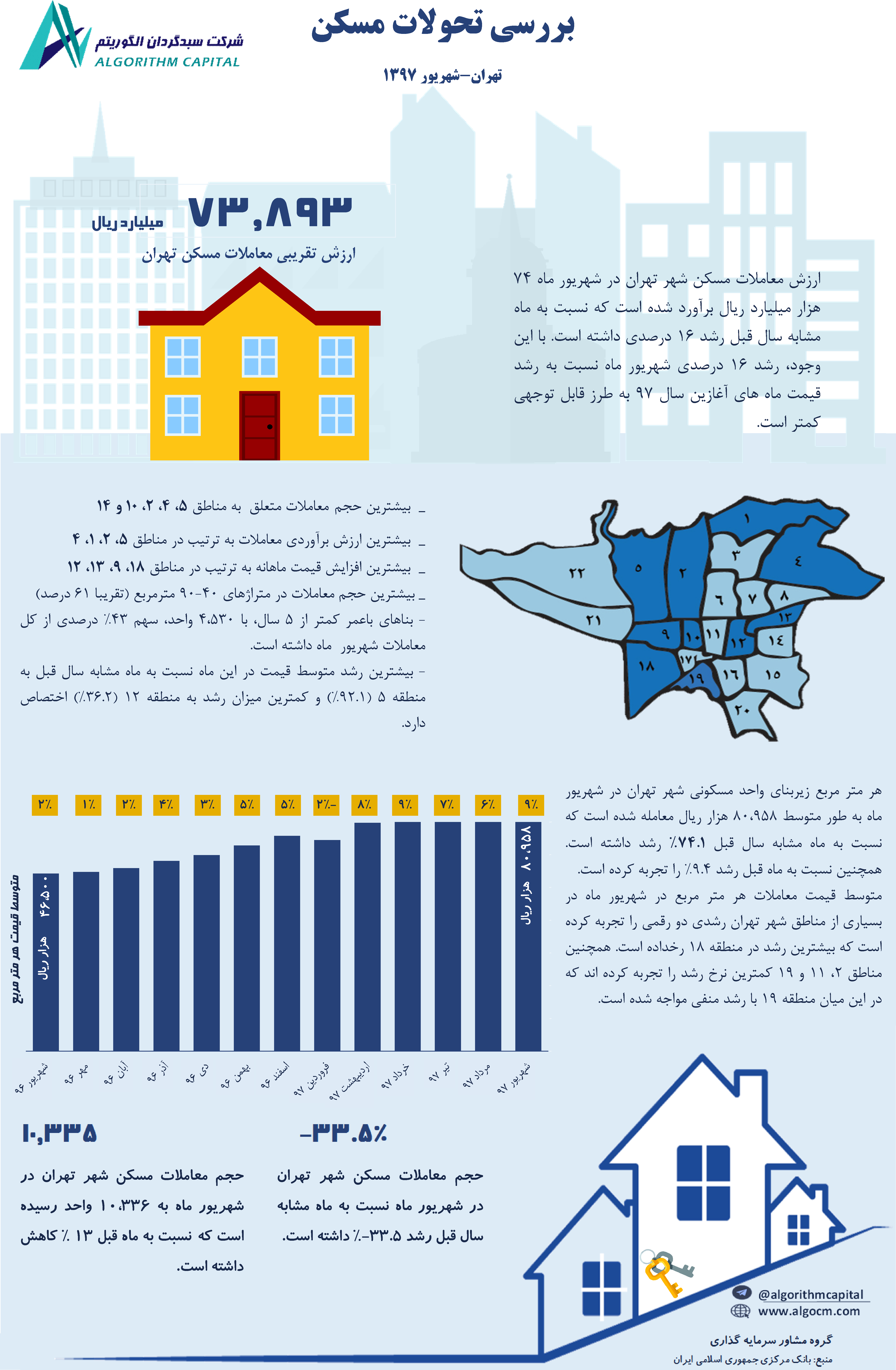 اینفوگرافیک بررسی ماهانه تحولات مسکن شهر تهران نشان از ادامه روند رکودی این بخش دارد.