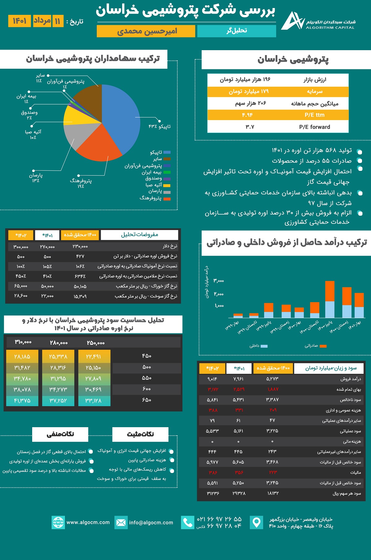 شــرکت پتروشــیمی خراسـان در سـال 1369 تاسـیس و در سـال 1375 بـه بهـرهبـرداری رسـیده اسـت. مرکـز اصلـی شـرکت و محـل فعالیـت آن در شهرسـتان بجنـورد واقـع در اسـتان خراسـان شـمالی اسـت. ایـــن مجتمــع پتروشــیمی در ســال 1391 در بازار دوم فرابورس با نماد خراسـان پذیرفتــه شــد و در سـال 1397 نیز در بازار دوم بورس پذیرفته شـد. عمدهتریـن مـاده اولیـه شـرکت گاز طبیعـی اسـت کـه از پالایشگاه خانگیران سرخس تامیـن میشـود. این شرکت با ظرفیت تولید 495 هزارتنی، 6 درصد ظرفیت تولید اوره کشور را دارا است.