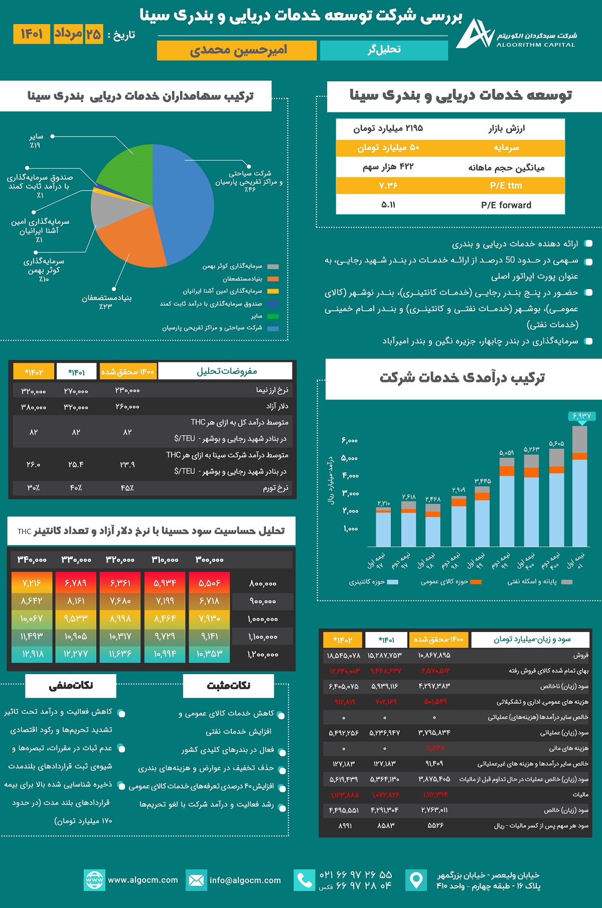 شرکت توسعه خدمات دریای و بندری سینا در سال 1366 تاسیس و فعالیت عملیاتی خود را از ابتدای سال 1367 آغاز نمود. با تشکیل سازمان حمل و نقل در سال 1370 در بنیاد مستضعفان، این شرکت به سازمان مذکور انتقال یافت. عملیات شرکت در بنادر جنوبی کشور از سالهای 1372 لغایت 1374 متوقف و نهایتا فعالیتهای شرکت راکد گردید. در سال 1374 مدیریت وقت سازمان حمل و نقل، ضمن انتقال شرکت از گروه جادهای به گروه دریایی و با تغییر مدیریت و مشارکت با بخش خصوصی، تصمیم به احیا شرکت و فعال نمودن مجدد آن گرفت. پس از تعیین هیات مدیره در اواخر سال 1374 شرکت توسعه خدمات دریایی و بندری سینا فعالیت عملیاتی خود را با هدف اصلاح ساختار عملیاتی و مالی با استراتژی جدید آغاز کرد و در طی سال های 1375 تا 1378 توانست با حل معضلات و مشکلات بجای مانده از گذشته، با افزایش سهم بازار خود و کسب سود بیشتر و پوشش زیان سنواتی، جایگاه خود را در بین رقبا تثبیت و سهم خود از بازار تخلیه و بارگیری را به میزان قابل توجهی افزایش دهد. در سال 1391 بنا به تصمیم سهامداران، نام و شخصیت شرکت به توسعه خدمات دریایی و بندری سینا و از سهامی خاص به سهامی عام تغییر یافت و در آذرماه سال 1392 وارد فرابورس گردید. در حال حاضر این شرکت در بنادر شهید رجایی، امام خمینی، بوشهر، چابهار و نوشهر فعالیت دارد و جهت توسعه فعالیتهای خود در بنادر چابهار، نگین و امیر آباد سرمایهگذاری نموده است.