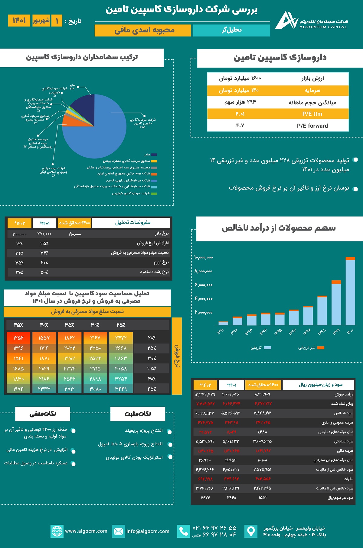 شرکت داروسازی کاسپین تأمین وابسته به گروه سرمایه گذاری دارویی تأمین (TPICO) میباشد. تولیدات این شرکت در کنار بخش آمپول که اصلی ترین شکل دارویی تولیدی است، اشکال نیمه جامدات (کرم، پماد، ژل و شیاف) و محلولهای خوراکی و شربتها نیز می باشد. در مجمع عادی فوق العاده این شرکت افزایش سرمایه صد درصدی از محل مطالبات حال شده سهامداران و آورده نقدی تصویب شده است. سهام این شرکت در حال حاضر با نماد كاسپين در بازار دوم فرابورس تهران قابل معامله است.