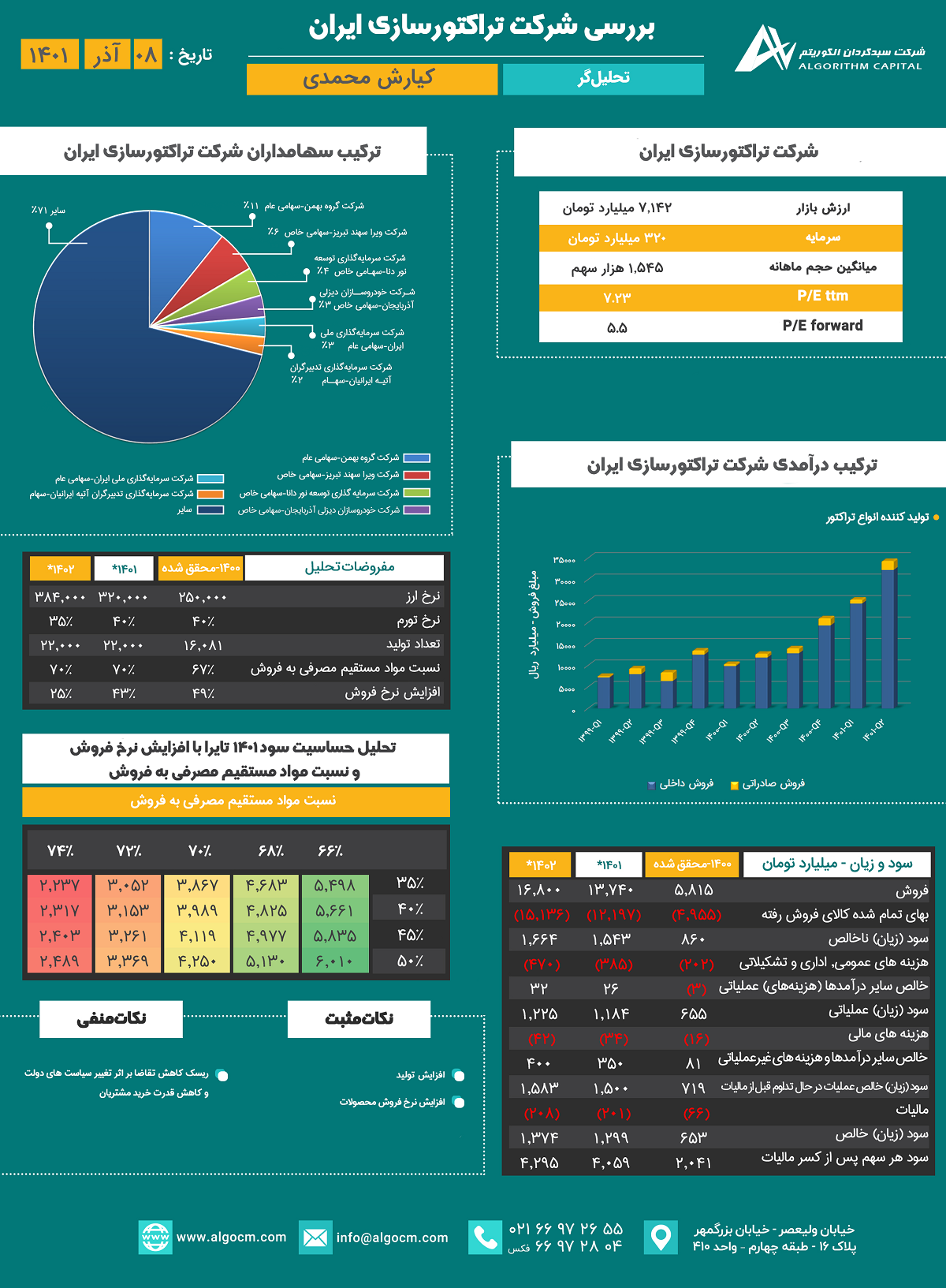 شركت تراكتورسازي ايران در حال حاضر با توليد انواع تراكتورهاي سبك، متوسط، نيمه سنگين و سنگين بعنوان بزرگترين توليد كننده تراكتور در سطح خاورميانه مطرح مي باشد. این شرکت در کنار فعاليت اصلي، در راستاي برنامه هاي توسعه اي خود و با هدف تنوع گرايي در ارائه محصولات ، ايجاد و يا افزايش توليد و عرضه برخي ديگر از محصولات را در برنامه هاي خود قرار داده است که عبارتند از: توسعه توليد و فروش انواع ابزارهاي مخصوص، ابزار دقيق و ابزارهاي پيچيده برشي مورد نياز خطوط توليد و مونتاژ صنايع کشور؛ برنامه ريزي براي توليد و عرضه انواع ادوات کشاورزي پيشرفته و تکنولوژي بالا و نيز انواع بکهولودر با کاربري راهسازي و عمراني ، توسعه فروش قطعات يدکي تراکتور از طريق افزايش سهم بازار و نيز پاسخگويي موثرتر به نيازهاي کشور در اين زمينه و همچنين افزايش فروش و صادرات انواع موتورهاي صنعتي، کشاورزي و خودرويي به همراه انواع قطعات ريخته گري ؛ مجموعه اين فعاليت ها در قالب کسب و کارهاي مختلف در شرکت مادر و شرکت هاي زير مجموعه گروه صنعتي تراکتورسازي ايران به انجام مي رسد.