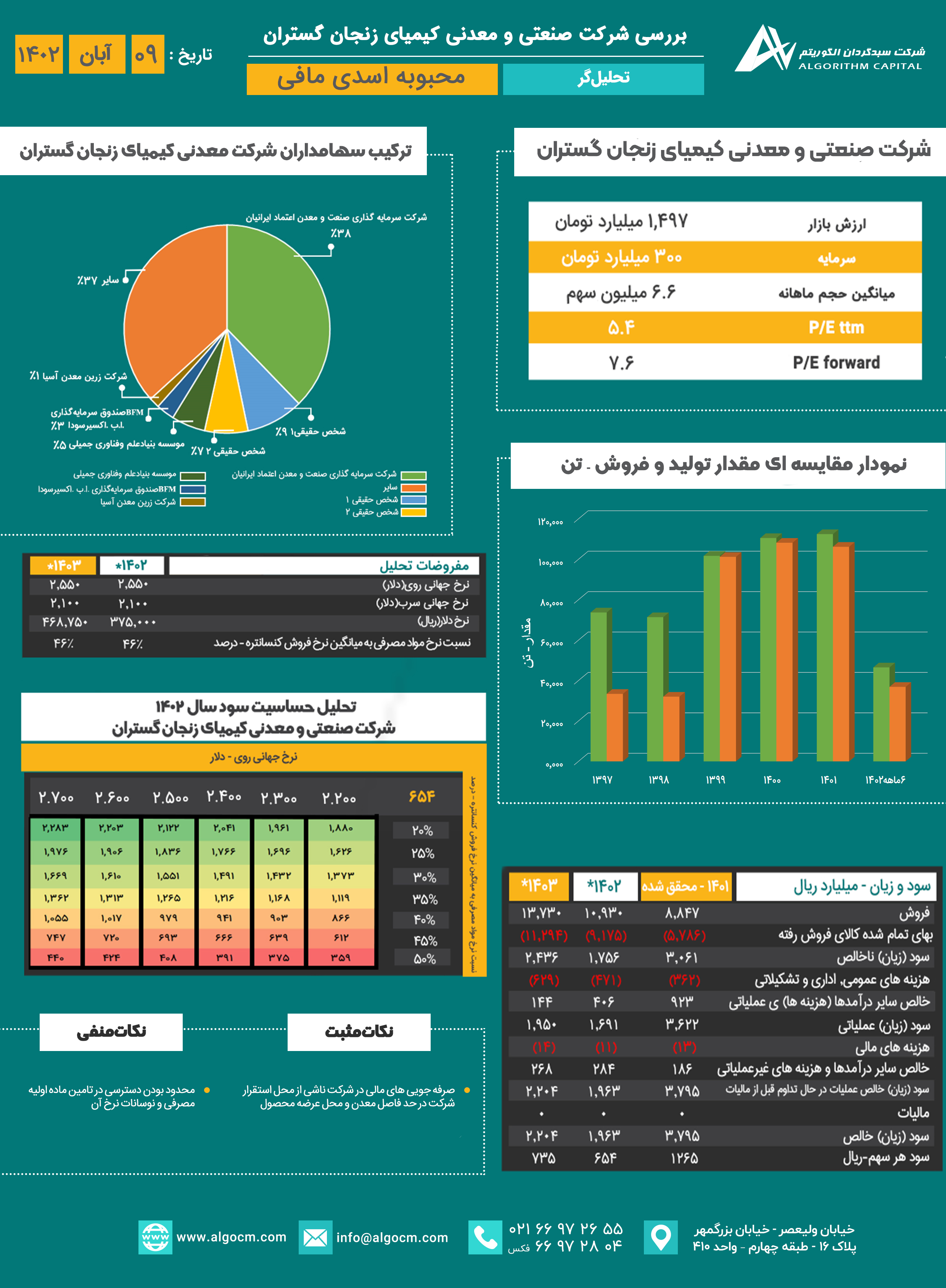 شرکت صنعتی و معدنی کیمیای زنجان گستران یکی از فعالین صنعت تولید کنسانتره روی، سرب و شمش روی است. این شرکت جزء شرکتهای فرعی شرکت سرمایه¬گذاری صنعت و معدن اعتماد ایرانیان میباشد. قیمتگذاری محصولات تولیدی این شرکت از قیمت جهانی فلز روی و سرب تبعیت میکند. مبنای محاسبه قیمت فروش محصولات، بازار فلزات لندن (LME) است.