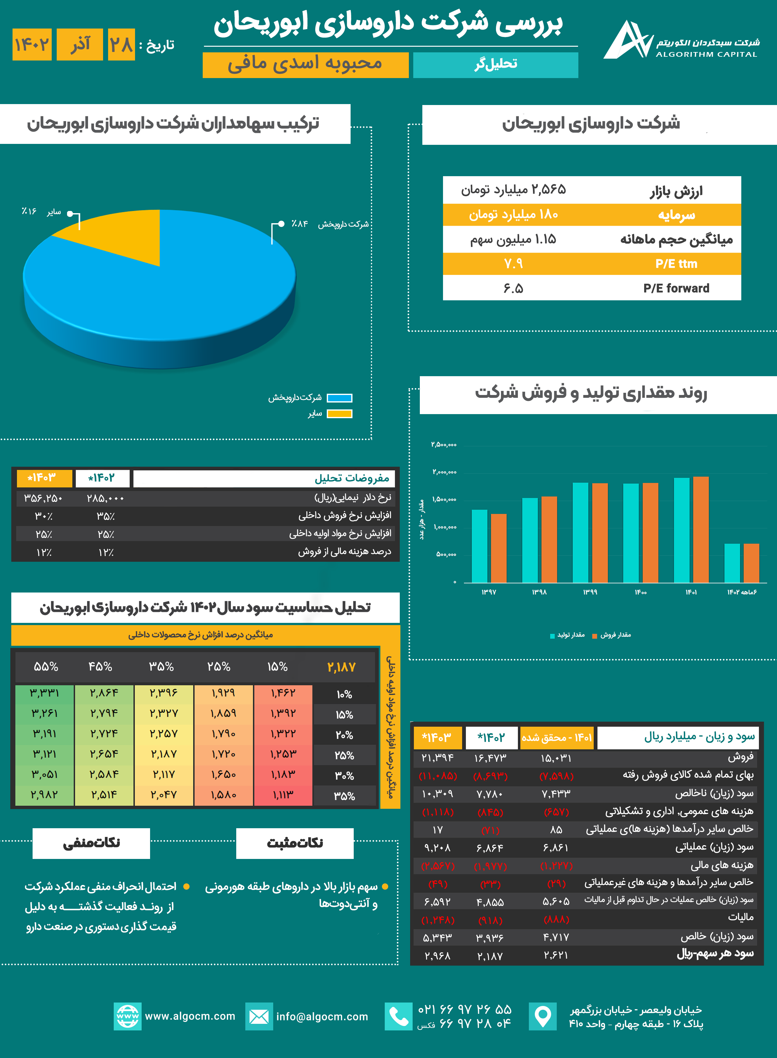 شرکت داروسازی ابوریحان جزء شرکتهای فرعی داروپخش بوده و واحد تجاری نهایی گروه، شرکت سرمایهگذاری تأمین اجتماعی میباشد. تولیدات شرکت در دو گروه داروهای انسانی و دامی طبقهبندی میشود. این شرکت به عنوان یکی از بزرگترین تولیدکنندگان داروهای هورمونی در کشور فعال است و محصولات خود را در بازار داخلی و در برخی کشــورهای آسیایی، حوزه CIS و کشــورهای آفریقایی ( اوگاندا ) عرضه مینماید.