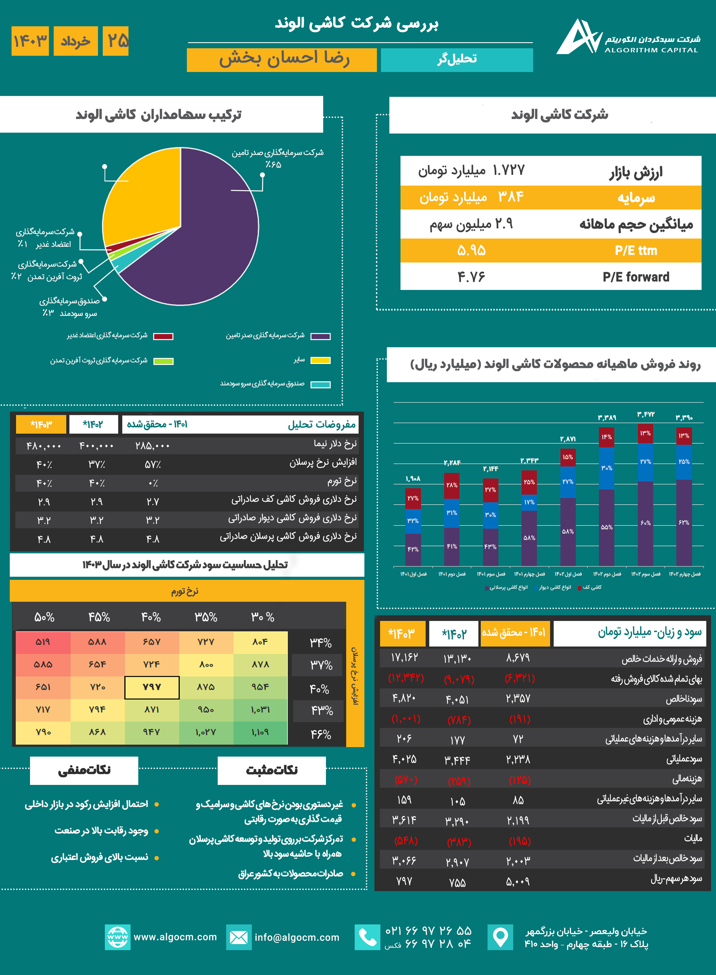 شرکت کاشی الوند در سال ۱۳۶۳ با هدف تولید انواع کاشی و سرامیک تاسیس گردید. این شرکت در سال ۱۳۷۳ در سازمان بورس اوراق بهادر پذیرفته و به شرکت سهامی عام تبدیل گردید.سهامدار شرکت عمده کاشی الوند، شركت سرمایه گذاری صدر تامین با ۶۴درصد از سهام میباشد و نقش کنترلی در این شرکت ایفا میکند. این شرکت با فروش ۱۳،۱۳۰ میلیارد ریال در سال ۱۴۰۲ در بین شرکتهای فعال در صنعت تولید کاشی و سرامیک در رتبه ۳ام در بین شرکتهای بورسی گروه خود قرار دارد .شرکت در سال ۱۴۰۲ توانسته است ۱۳،۱۳۰میلیارد ریال فروش داشته باشد و سود ناخالص ۳۱درصدی و سود خالص ۲۲درصدی را محقق کند.از عوامل تاثیرگذار بر سودآوری شرکت میتوان به میزان افزایش نرخ کاشی پرسلان بعنوان محصول اصلی این شرکت، نرخ لعاب به عنوان ماده اولیه اصلی اشاره نمود.