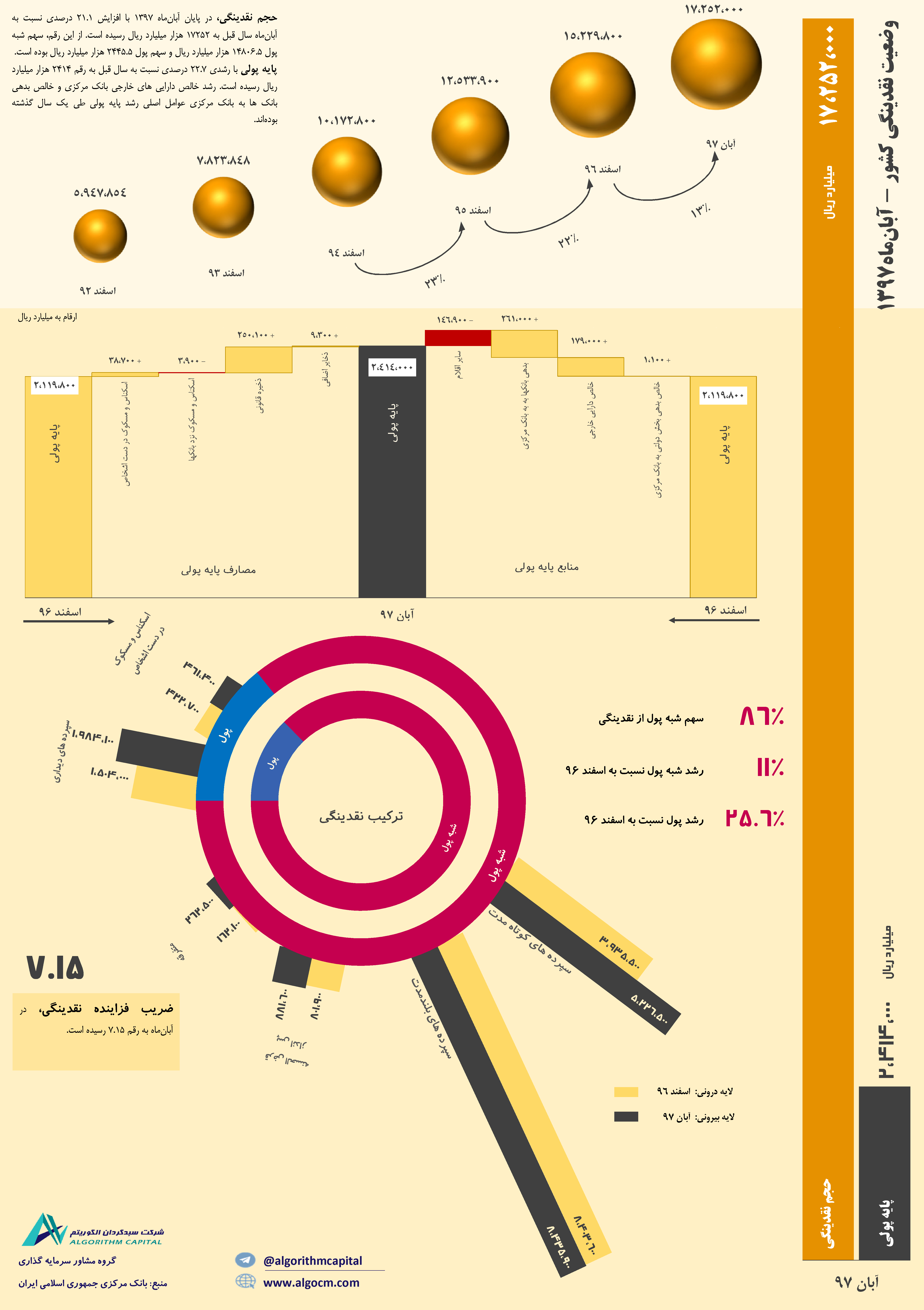 اینفوگرافیک حجم نقدینگی، در پایان آبانماه ۱۳۹۷ با افزایش ۲۱.۱ درصدی نسبت به آبانماه سال قبل به ۱۷۲۵۲ هزار میلیارد ریال رسیده است.