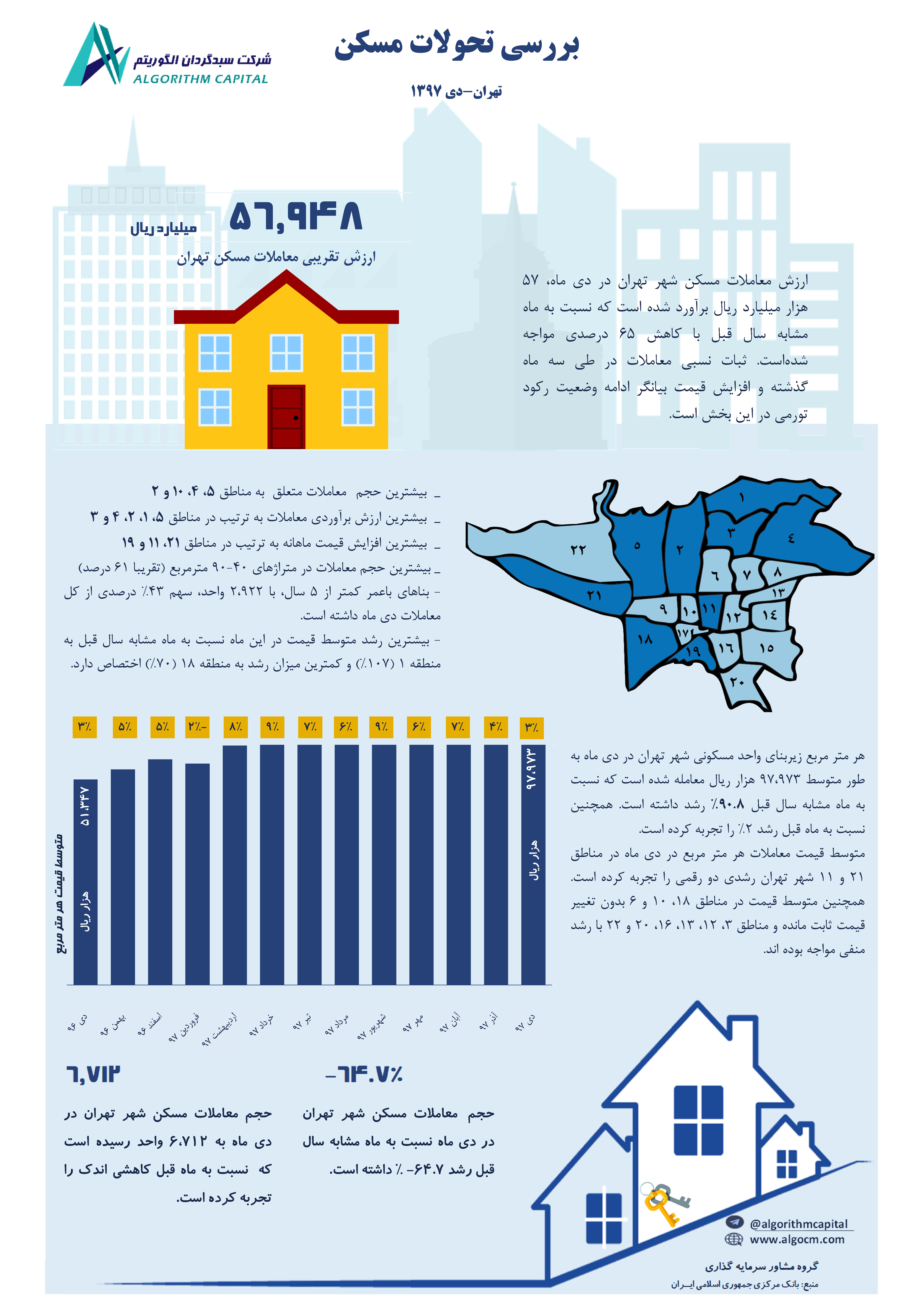 اینفوگرافیک بررسی ماهانه تحولات مسکن شهر تهران حاکی از افزایش قیمت مسکن در کنار ثبات نسبی تعداد معاملات در طی ۳ ماه گذشته است.